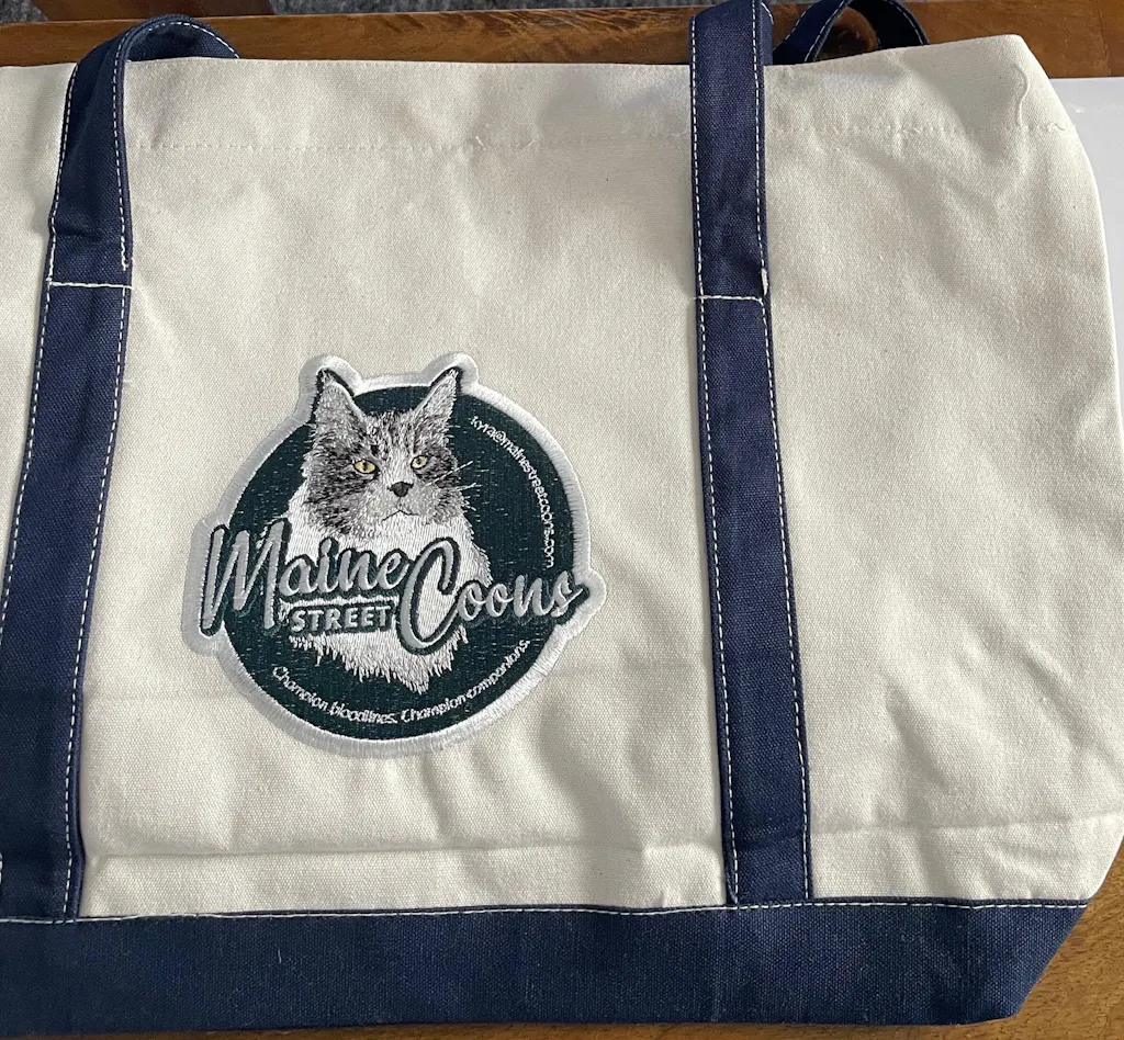 I just adopted a Maine Coon cat, and I wanted to put together a gift bag to give to my breeder when I picked up our cat. I sent the cattery logo to Pupsentials, and they made this AMAZING bag. The quality is impeccable! The detail and thread colors are perfect - and the bag itself is great (love the navy straps!). It was such a fun present to give, with this bag holding everything! Also, the Pupsentials customer service team went above and beyond - personal emails, etc. They assured me I would get the bag in time and I did. Everything about this experience was STELLAR, and I definitely will be placing more orders in the future. Thank you!!